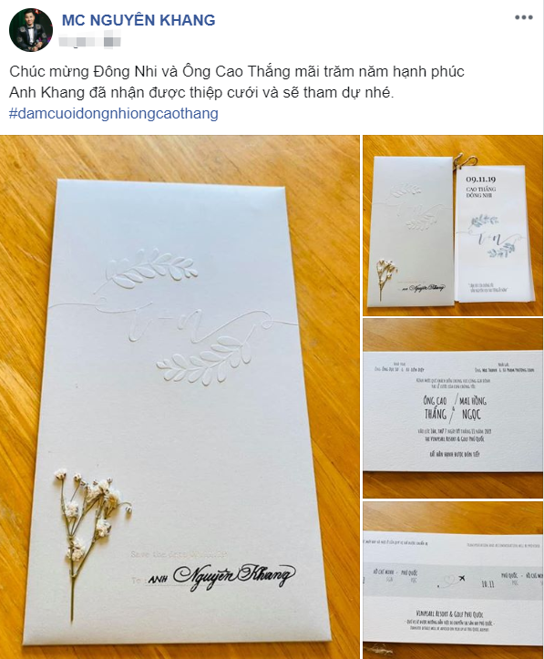 Noo Phước Thịnh xác nhận đã nhận thiệp mời và khẳng định dù có bận đến mấy cũng sẽ thu xếp đến chung vui với bạn. Trong khi đó Ngô Kiến Huy thì rình rang khoe thiệp cưới, hủy show để tham dự hôn lễ của Đông Nhi. Khổng Tú Quỳnh thì ngay khi Đông Nhi công bố ngày cưới đã liền đăng bài lên trang cá nhân bày tỏ sự vui mừng.