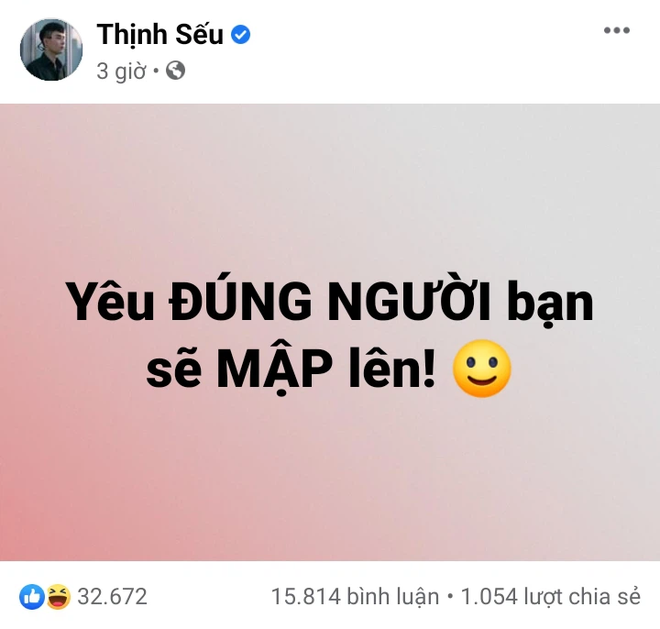 Theo đó, trên trang cá nhân có gần 400 ngàn người theo dõi, Thịnh Sếu chia sẻ một chân lí tình yêu muôn thuở: "Yêu đúng người bạn sẽ mập lên!". Ngay lập tức, bài viết thu hút nhiều sự tranh luận của không ít dân mạng. Có lẽ, nhóm người tranh cãi quyết liệt nhất chính là hội ế truyền kỳ nhưng vẫn không ốm nổi. Và người đại diện nổi bật không ai khác chính là diễn viên Ngọc Lan.