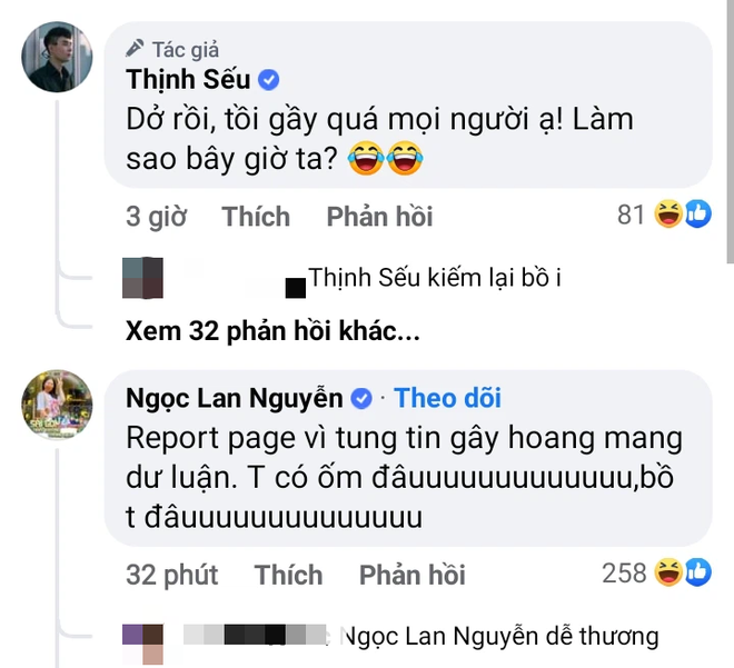 Dưới bài đăng, nữ diễn viên "phẫn nộ" đưa ra ngay lời tuyên bố đanh thép khiến dân tình ngã ngửa: "Report page vì tung tin gây hoang mang dư luận. Tui có ốm đâu, bồ tui đâu". Comment dạo của Ngọc Lan khiến cư dân mạng có một tràng cười rôm rả. Không biết họ cười chọc quê hay cười đồng cảm với "dì Trang" Ngọc Lan đây?