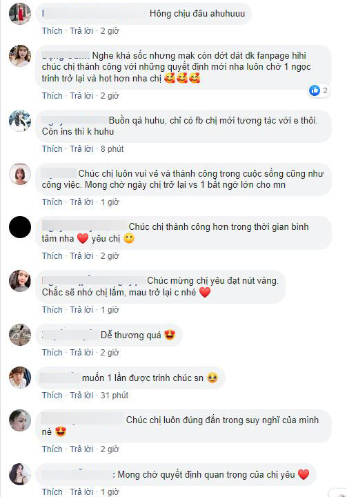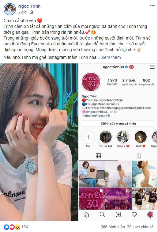 Trong những ngày bước sang tuổi mới, trước những quyết định mới, Trinh sẽ tạm thời đóng Facebook cá nhân một thời gian để bình tâm cho 1 số quyết định quan trọng. Mong được mọi người yêu thương chờ Trinh trở lại nhé".