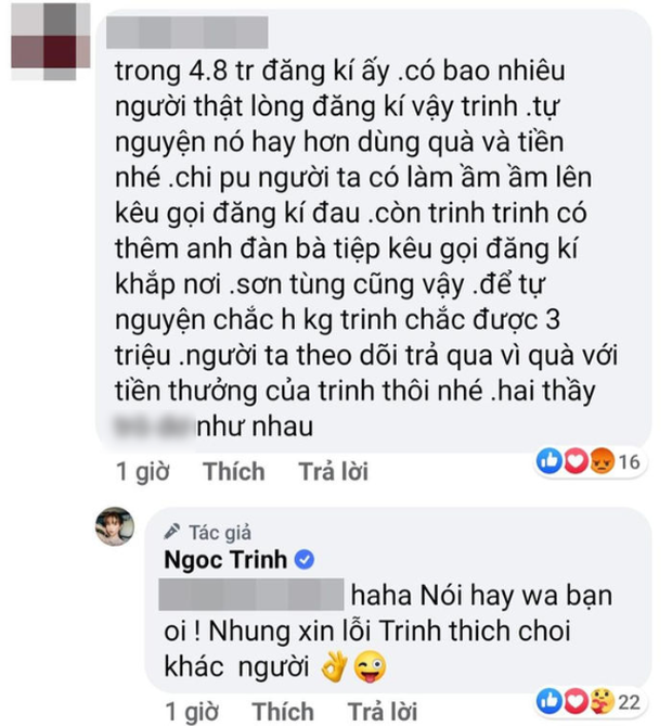 Ngay khi tài khoản Instagram của Ngọc Trinh nhảy vọt từ 4,5 triệu lên 4,8 triệu trong một thời gian ngắn, đã có nhiều người đặt câu hỏi nghi vấn. Một cư dân mạng để lại bình luận gây chú ý: "Trong 4,8 triệu đăng ký ấy, có bao nhiêu người thật lòng vậy Trinh? Tự nguyện hay dùng quà và tiền?..."Vốn không ngại thị phi, Ngọc Trinh bình thản đáp trả lại: "Nói hay quá bạn ơi, nhưng xin lỗi Trinh thích chơi khác người". Về phần ông bầu Vũ Khắc Tiệp, anh cũng lên tiếng bênh vực bạn thân khi bị tố mua follow.