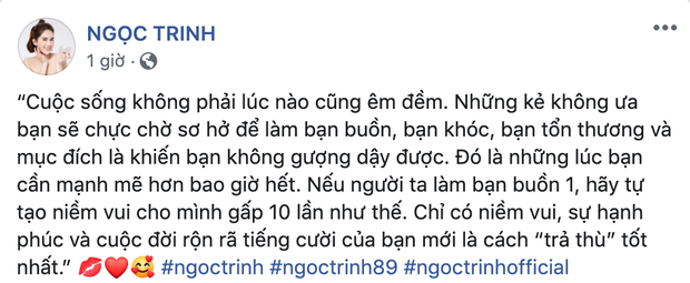Mới đây, người đẹp gốc Trà Vinh bất ngờ đăng tải dòng trạng thái ám chỉ cách trả thù những kẻ làm mình buồn, mình tổn thương. Theo Ngọc Trinh thì "chỉ có niềm vui, sự hạnh phúc và cuộc đời rộn rã tiếng cười của bạn mới là cách "trả thù" tốt nhất."