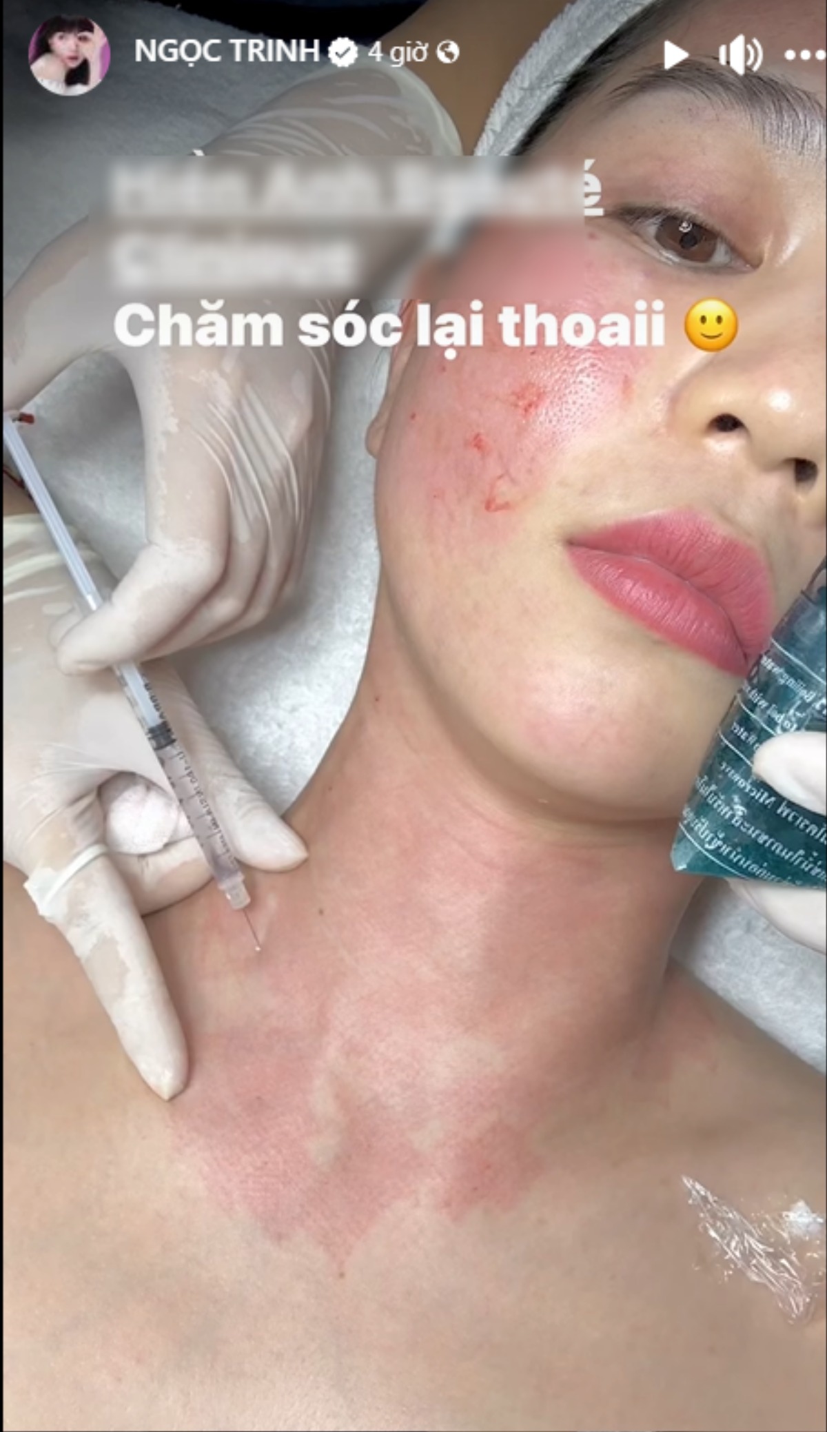 Trong bức ảnh được chia sẻ, Ngọc Trinh không ngần ngại chụp lại quá trình đang tiêm các chất có lợi cho làn da. Tuy nhiên, điều khiến cộng đồng mạng đặc biệt chú ý chính là những vết máu nhỏ chi chít trên mặt "nữ hoàng nội y". Nhiều ý kiến cho rằng, vì Ngọc Trinh mới hoàn thành xong phần vùng má, chắc đường kim vẫn còn mới nên việc rỉ máu là đương nhiên.