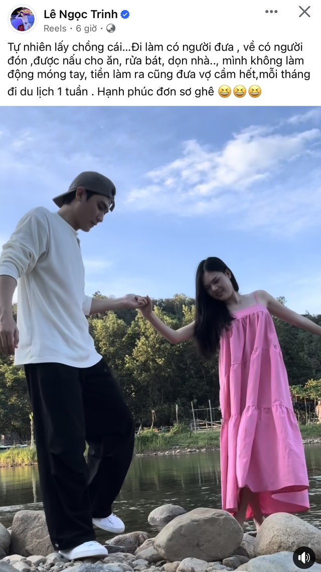 Ngọc Trinh gây bất ngờ khi tiết lộ đã lấy chồng: "Tự nhiên lấy chồng cái, đi làm có người đưa, về có người đón, được nấu cho ăn, rửa bát, dọn nhà. Mình không làm động móng tay, tiền làm ra cũng đưa vợ cầm hết. Mỗi tháng đi du lịch 1 tuần. Hạnh phúc đơn sơ ghê". Trên story trang cá nhân, nữ diễn viên cũng chia sẻ hình ảnh mới kèm dòng chú thích: "Hưởng tuần trăng mật gì 2 tuần chưa muốn về".