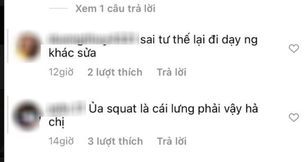 Rất nhiều khán giả đã để lại bình luận dưới bài đăng và khẳng định cô nàng đã tập sai tư thế. Thậm chí, một vài ý kiến còn chỉ trích và cho rằng cô nàng là người nổi tiếng, nên cẩn thận hơn trong việc chia sẻ kinh nghiệm lên trang cá nhân vì có thể một số người sẽ làm theo và để lại hậu quả khôn lường. Bởi lẽ, việc tập squat bị võng lưng sẽ khiến người tập nhẹ thì bị đau lưng dưới, tướng người xấu đi, nặng thì sẽ có nguy cơ gây ra gãy lưng khi thực hiện với tạ nặng.