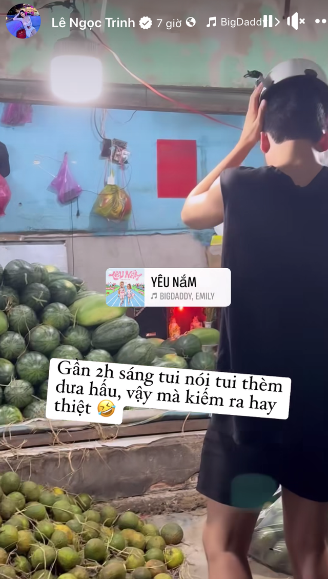 Diễn viên Ngọc Trinh cho biết do cô muốn ăn dưa hấu nên nửa kia đã chiều chuộng ngay lập tức, tự tay đi lựa mua vào lúc rạng sáng. "Gần 2 giờ sáng tôi nói tôi thèm dưa hấu. Vậy mà kiếm ra hay thiệt", cô bày tỏ sự hạnh phúc.