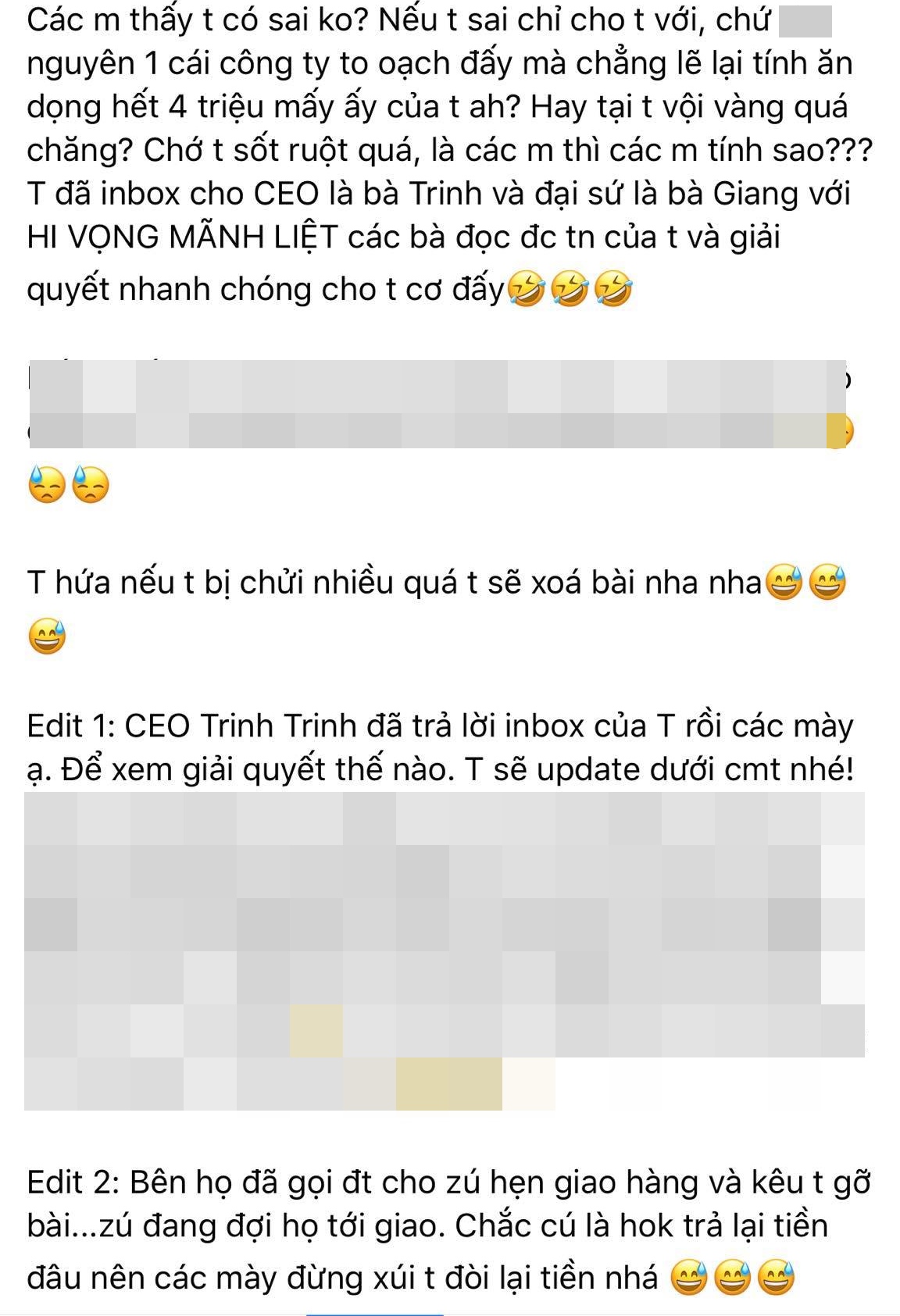 Cụ thể, cư dân mạng này cho biết sau khi nhắn tin và được tư vấn thì cô đã chuyển khoản hơn 4 triệu để mua sản phẩm làm đẹp của công ty Ngọc Trinh. Tuy nhiên, 2 tuần sau khách hàng này vẫn chưa nhận được đồ đã đặt mua, nhắn tin qua fanpage thì tiếp tục bị hẹn từ ngày này qua ngày khác vẫn không thấy hàng đến. Phía công ty còn khẳng định đã gửi đồ đi nhưng không xuất ra được giấy tờ nào chứng minh hàng đã được vận chuyển đến người mua.