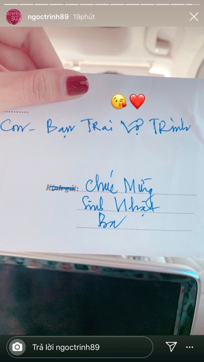 Đáng chú ý với màn khoe quà này, Ngọc Trinh đã tiết lộ cách xưng hô của cô và bạn trai. Cụ thể, bạn trai Ngọc Trinh đã khéo léo viết: "Con - bạn trai vợ Trinh chúc mừng sinh nhật ba mẹ" khiến nhiều người không khỏi ngưỡng mộ. Trước đó, người đẹp U30 cũng bất ngờ bày tỏ: "Em hạnh phúc khi có anh" khiến người hâm mộ hy vọng cặp đôi sẽ sớm công khai và có một cái kết viên mãn trong tương lai gần. Được biết, người đẹp từng hiếm hoi tiết lộ bạn trai là đại gia, hơn cô rất nhiều tuổi.