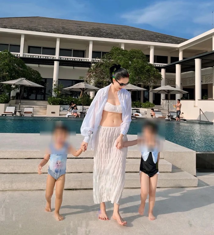 Mới đây, Ngọc Trinh tổ chức buổi du lịch nghỉ dưỡng cùng với gia đình ở một resort hạng sang. Cô nàng rạng rỡ dẫn hai cháu đến hồ bơi cùng trang phục màu trắng để lộ vòng eo quyến rũ cùng "cặp tuyết lê" đầy đặn.