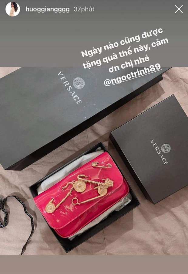Khi Hương Giang vừa thăng chức lên làm CEO, Ngọc Trinh đã mạnh tay sắm túi Versace màu đỏ trị giá 25 triệu tặng chúc mừng.