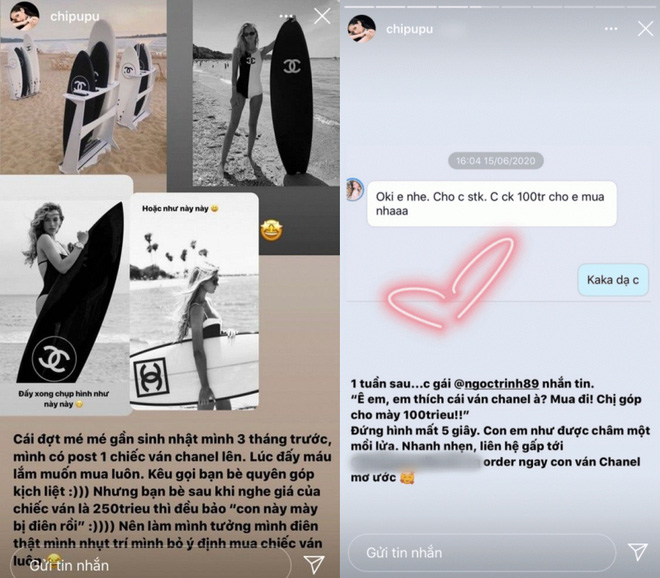 Tháng 9 vừa qua, dân mạng được phen ngỡ ngàng khi Ngọc Trinh chuyển khoản liền tay cho Chi Pu 100 triệu sau khi thấy "đàn em" bày tỏ mong muốn được sở hữu chiếc ván lướt sóng của Chanel trên mạng.