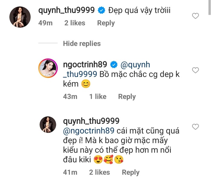 Dưới bài viết, người mẫu Quỳnh Thư không ngớt lời khen dành cho người bạn thân của mình. Cô bình luận: "Đẹp quá vậy trời". Theo đó, Ngọc Trinh cũng đã gửi những lời có cánh dành cho cô bạn thân: "Bồ mặc chắc cũng đẹp không kém". Sau đó, Quỳnh Thư liền "phản bác" lại: "Cái mặt cũng quá đẹp í! Mà không bao giờ có thể mặc đẹp hơn Trinh nổi đâu".