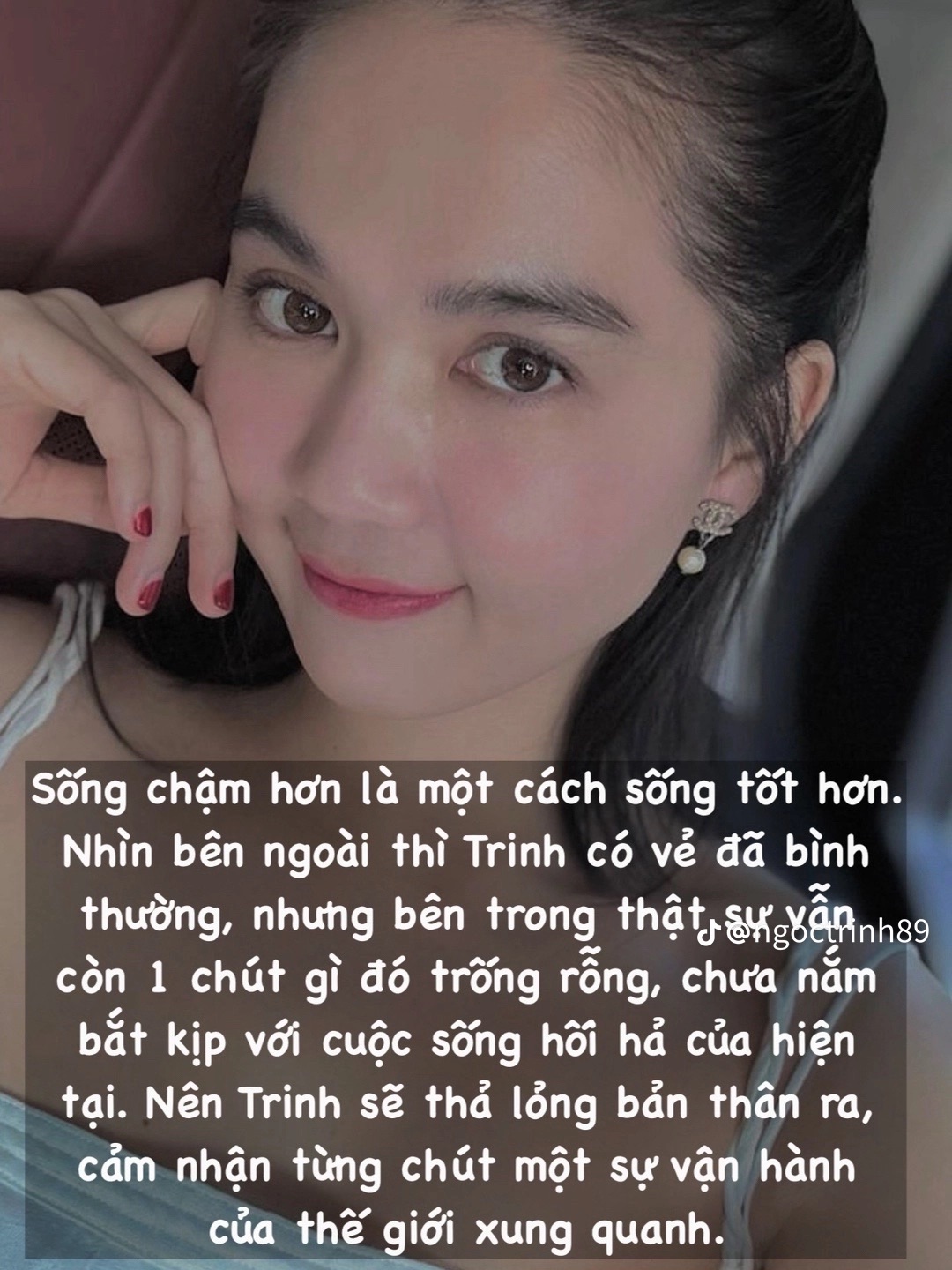 Vào ngày 19/2, Ngọc Trinh đã đăng tải hình ảnh mới trên mạng xã hội. Người mẫu sinh năm 1989 chia sẻ về phong cách sống sẽ theo đuổi trong năm 2024. Cô tiết lộ sự thay đổi của bản thân sau khi được hưởng án treo: "Sống chậm hơn là một cách sống tốt hơn. Nhìn bề ngoài thì Trinh có vẻ đã bình thường nhưng bên trong thật sự vẫn còn 1 chút gì đó trống rỗng, chưa nắm bắt kịp với cuộc sống hối hả".