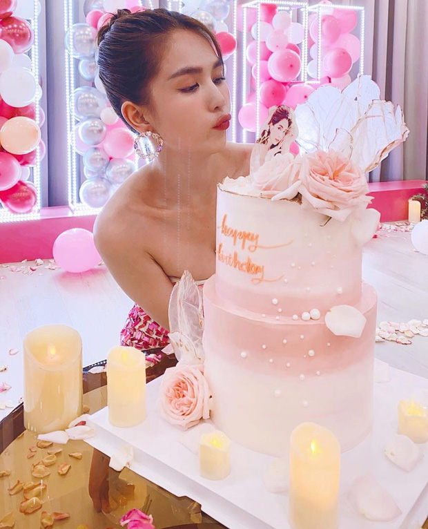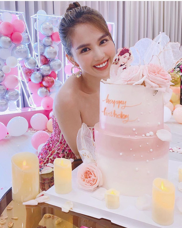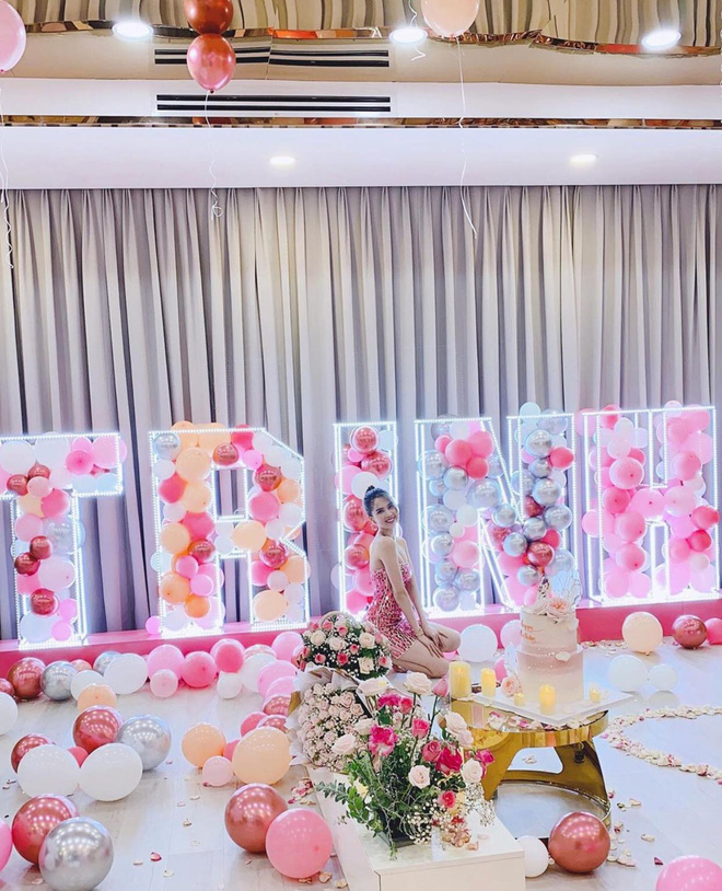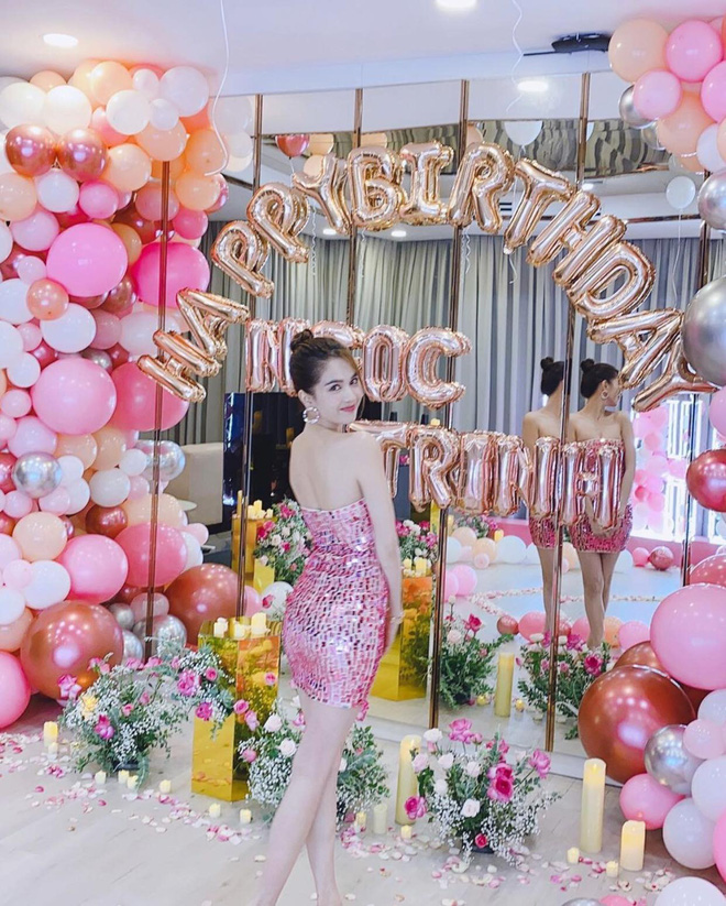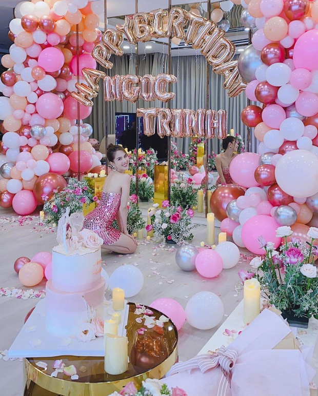 Có thể thấy, buổi tiệc lấy màu hồng và trắng làm chủ đạo, được bày trí nhiều hoa tươi và bóng bay vô cùng lung linh. Là nhân vật chính, Ngọc Trinh chọn chiếc váy lấp lánh, ôm sát body và khoe luôn vai trần gợi cảm. "Nữ hoàng nội y" vui vẻ, tươi tắn hết mức trong ngày ăn mừng tuổi mới.