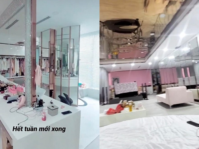 Hết bị Vũ Khắc Tiệp để lộ khoảnh khắc đi dép bẩn và đặt chân lên giường ngủ, Ngọc Trinh tiếp tục gây sốc vì toàn cảnh thực tế phòng đồ hiệu khác 180 độ so với khi quay clip "sống ảo". Có thể thấy, đồ hiệu của Ngọc Trinh đang đặt vô cùng lộn xộn, bừa bộn dưới sàn nhà chẳng khác gì... bãi chiến trường. Ngoài ra, các bàn đặt đồ make up của cô cũng trông không hề ngăn nắp đến nỗi chính chủ phải thừa nhận: "Bừa bộn quá, Thuý Kiều đâu rồi sao không dọn dẹp vậy".
