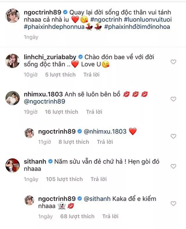 Trên mạng xã hội, người mẫu Linh Chi gửi lời chào đón người chị thân thiết lâu năm đã trở về với cuộc sống độc thân. Trong khi đó, Sĩ Thanh lại hỏi thẳng Ngọc Trinh rằng: "Năm Sửu (2021- pv) vẫn đẻ chứ hả? Hẹn rồi đó".