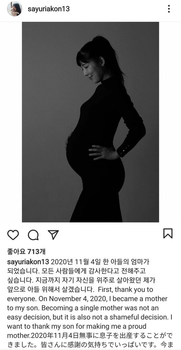 Ngày 16/11, ngôi sao truyền hình Hàn Quốc gốc Nhật Fujita Sayuri đã đăng tải 1 bài viết trên Instagram cá nhân, thông báo về việc cô đã trở thành mẹ của 1 bé trai khỏe mạnh vào ngày 4/11 vừa qua. Điều đáng nói, Sayuri chưa kết hôn và thậm chí còn không có bất kỳ tin đồn hẹn hò nào.