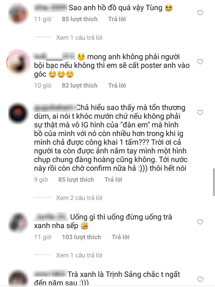 Điển hình là mới đây, rất nhiều netizen và cả người hâm mộ của Sơn Tùng đã đồng loạt vào bình luận ở bài đăng gần nhất của anh chàng, tuyên bố sẽ "thoát fan", thậm chí chuyển sang anti nếu như anh thực sự rời bỏ bạn gái lâu năm vì sự xuất hiện của "trà xanh" là Hải Tú.