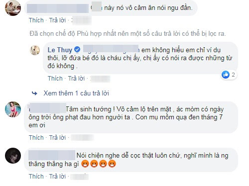 Cách đây ít giờ, người mẫu Lê Thúy cũng lên tiếng phản đối gay gắt phát ngôn của đàn chị ngay trên trang cá nhân: "Thế nào là do cha mẹ hả chị? Cha mẹ cố gắng làm lụng tiền bạc cho con học trường quốc tế mà chị nói là do cha do mẹ. Ở Hàn, ở Nhật... người ta cho con đi học bằng xe của trường hay xe bus từ lâu lắm rồi, vì các bé sẽ học được tính lự lập để cho cha mẹ chúng yên tâm mà kiếm tiền, để con cái mình được học ở nơi tốt nhất và an toàn đó chị.