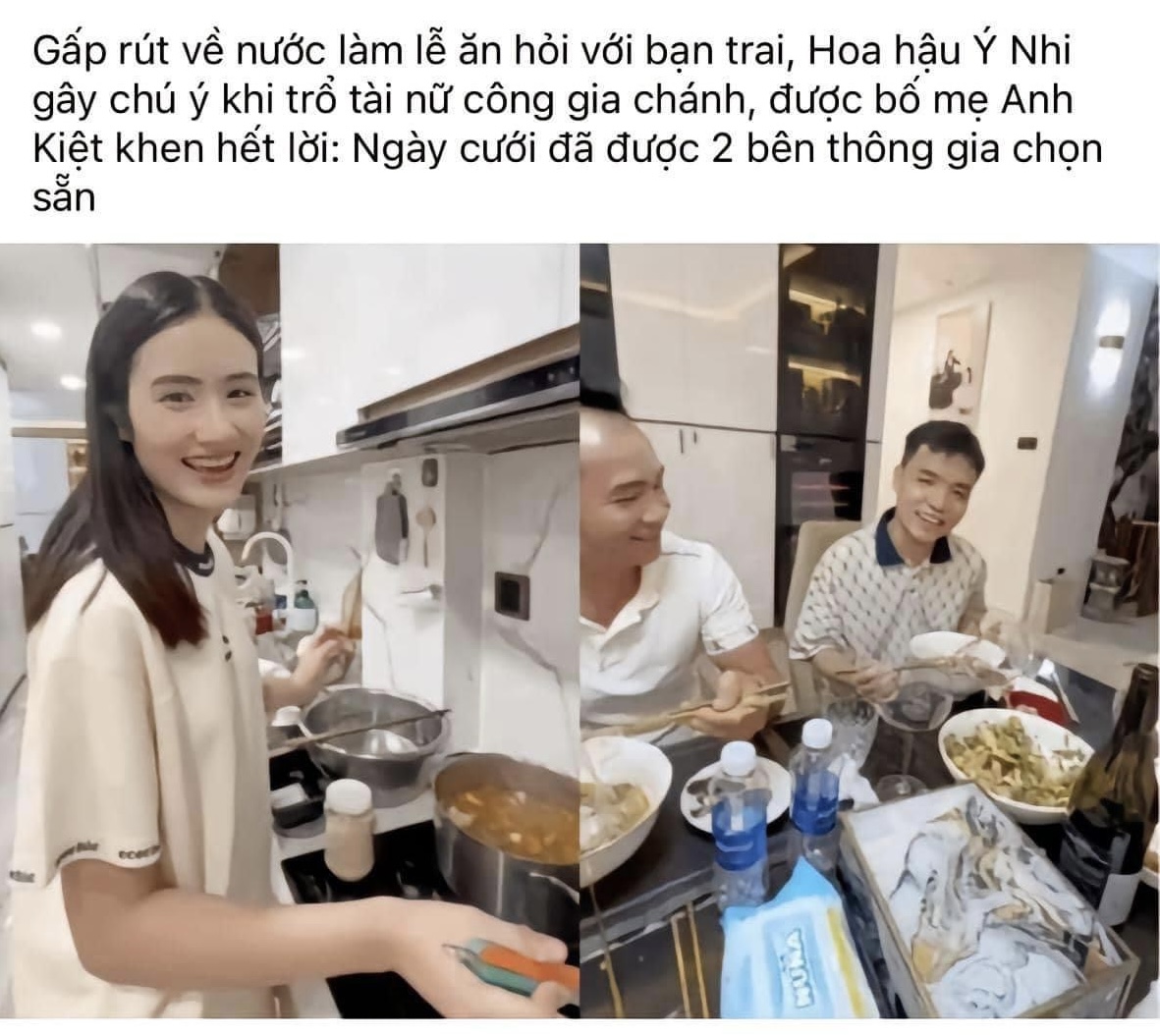 Nguyên do vì một bài viết đăng tải hình ảnh Hoa hậu Ý Nhi và bạn trai với nội dung: "Gấp rút về nước làm lễ ăn hỏi với bạn trai, Hoa hậu Ý Nhi gây chú ý khi trổ tài nữ công gia chánh, được bố mẹ Anh Kiệt khen hết lời" xuất hiện trên mạng xã hội. Thậm chí, bài đăng này còn cho biết phía gia đình của cả hai đã bàn bạc và chốt được ngày tổ chức lễ cưới.