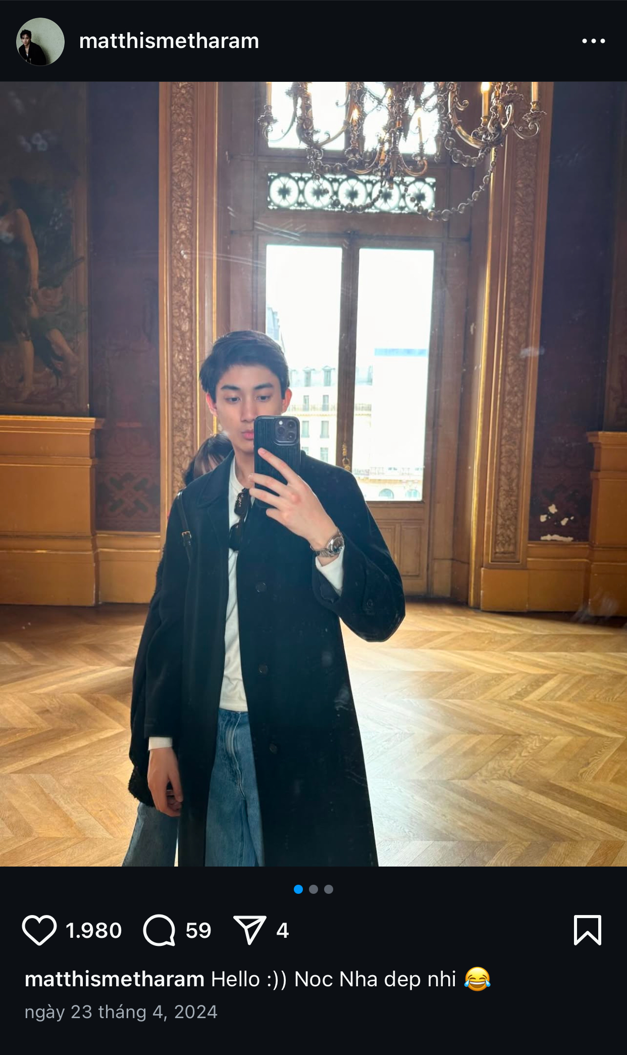 Sau thông báo chia tay của Thiều Bảo Trâm, Matthis cũng đã có động thái trên tài khoản cá nhân. Nam người mẫu sinh năm 2k4 viết: "New Year. Thank you to all my friends and family that supported me through and through once again. Lots of love and lessons… I hope everyone will find their peace and happiness this year". (Tạm dịch: Năm mới. Cảm ơn tất cả bạn bè và gia đình đã hết lòng ủng hộ tôi một lần nữa. Rất nhiều tình yêu và bài học… Tôi hi vọng rằng trong năm nay, ai cũng sẽ tìm được sự bình yên và hạnh phúc).