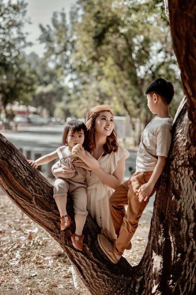 | Nguyễn Hồng Nhung hạnh phúc chơi đùa cùng 2 con |