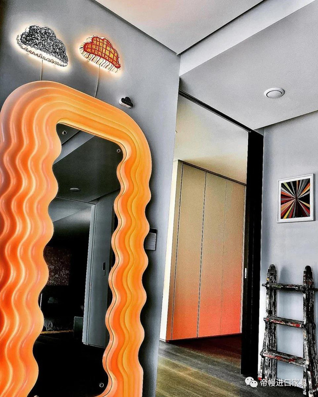 Phòng khách gây ấn tượng bởi chiếc gương Ultraflagola được thiết kế bởi kiến trúc sư nổi tiếng người Italya Ettore Sottsass. Chiếc gương này được rất nhiều ngôi sao nổi tiếng yêu thích có giá 9,690USD (khoảng 224 triệu VND).