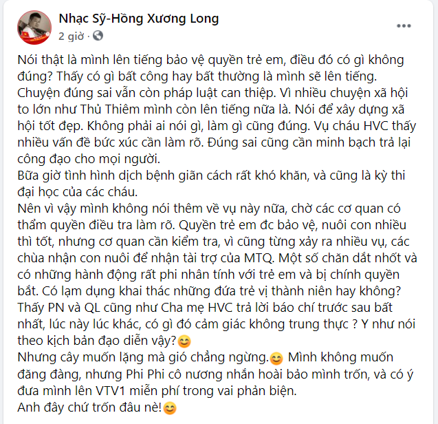 Trước đó, nhạc sĩ Hồng Xương Long cũng đăng bài khuyên Phi Nhung nên trả lại 200 triệu đồng tiền thưởng quán quân Vietnam Idol Kids cho Hồ Văn Cường và minh bạch trong chuyện tài chính, cát xê của con nuôi.