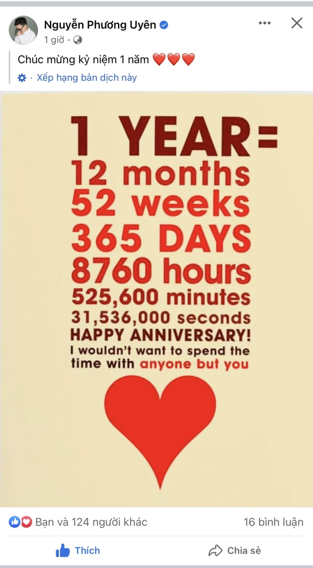Vào chiều 16/9, nhạc sĩ Phương Uyên đã đăng tải hình ảnh mới trên mạng xã hội. Nhạc sĩ sinh năm 1970 nhắn nhủ ngọt ngào tới ca sĩ Thanh Hà trong ngày đặc biệt. "Chúc mừng kỷ niệm 1 năm", Phương Uyên chia sẻ.