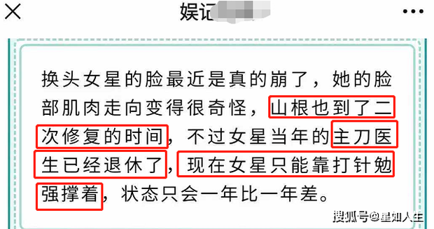 Đáng chú ý, trên MXH truyền tay nhau thông tin từ phía blogger về một sao nữ "đổi đầu" (ý chỉ phẫu thuật thẩm mỹ tới mức nhan sắc thay đổi 180 độ so với trước). Giờ đây, gương mặt của sao nữ này trở nên tàn tạ, các đường nét trở nên "kỳ quái", đã đến lúc cần phải "sửa chữa" lần thứ 2. Vậy nhưng, bác sĩ thẩm mỹ từng phẫu thuật chính cho sao nữ này năm xưa giờ đã nghỉ hưu. Chính vì lẽ đó, sao nữ này giờ đây chỉ có thể dựa dẫm vào các phương pháp tiêm mặt, tình trạng nhan sắc ngày càng xấu đi từ năm này qua năm khác. Nhiều Cnet cho rằng, người mà blogger này đang ám chỉ chính là Angela Baby.