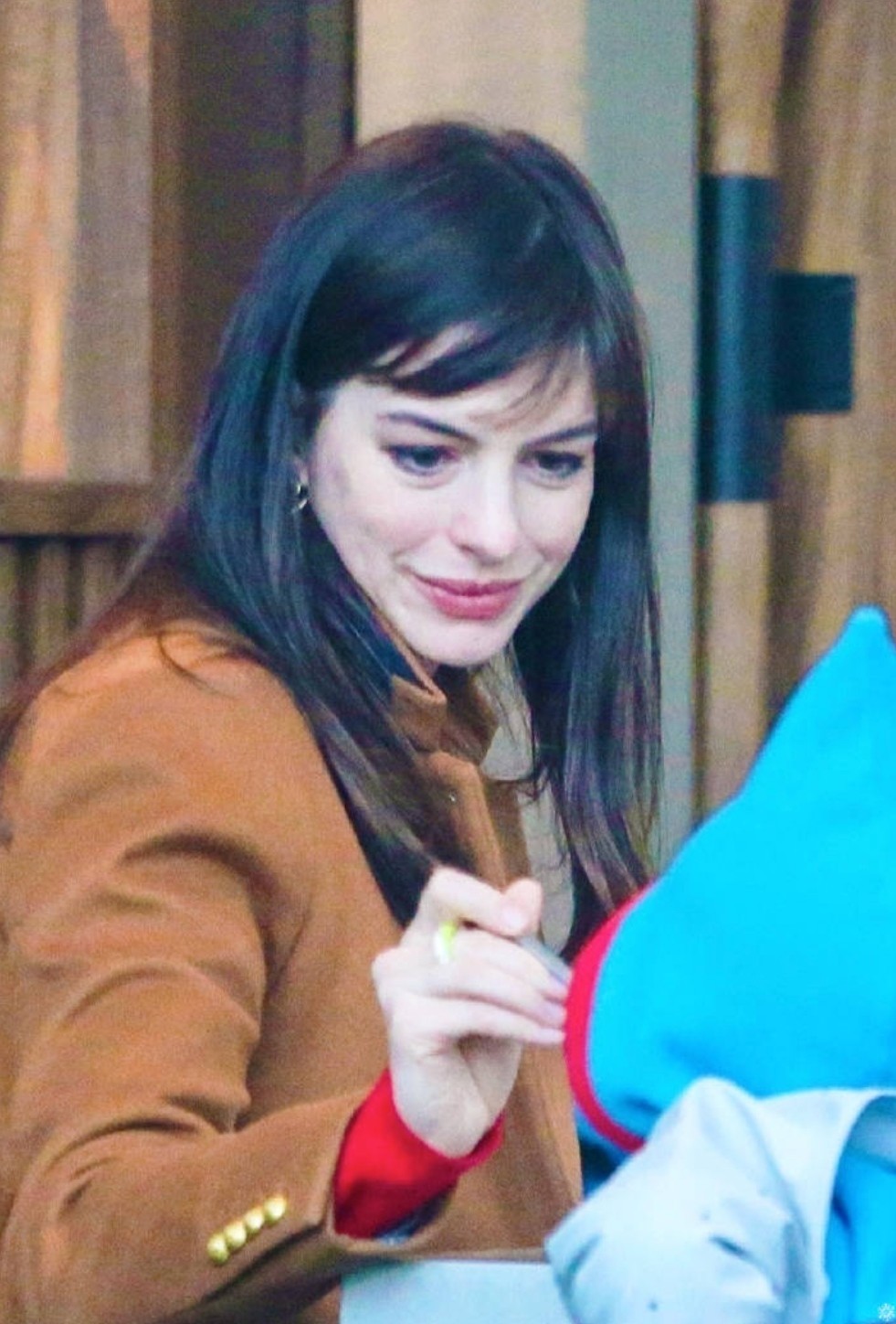 Cụ thể, vào ngày 17/3 vừa qua, một người qua đường đã vô tình gặp gia đình Anne Hathaway cùng chồng và con tại một nhà hàng. Trong loạt hình do người qua đường chụp, mỹ nhân "Yêu Nữ Hàng Hiệu" diện một chiếc áo khoác màu camel kết hợp cùng áo len đỏ rực rỡ bên trong.