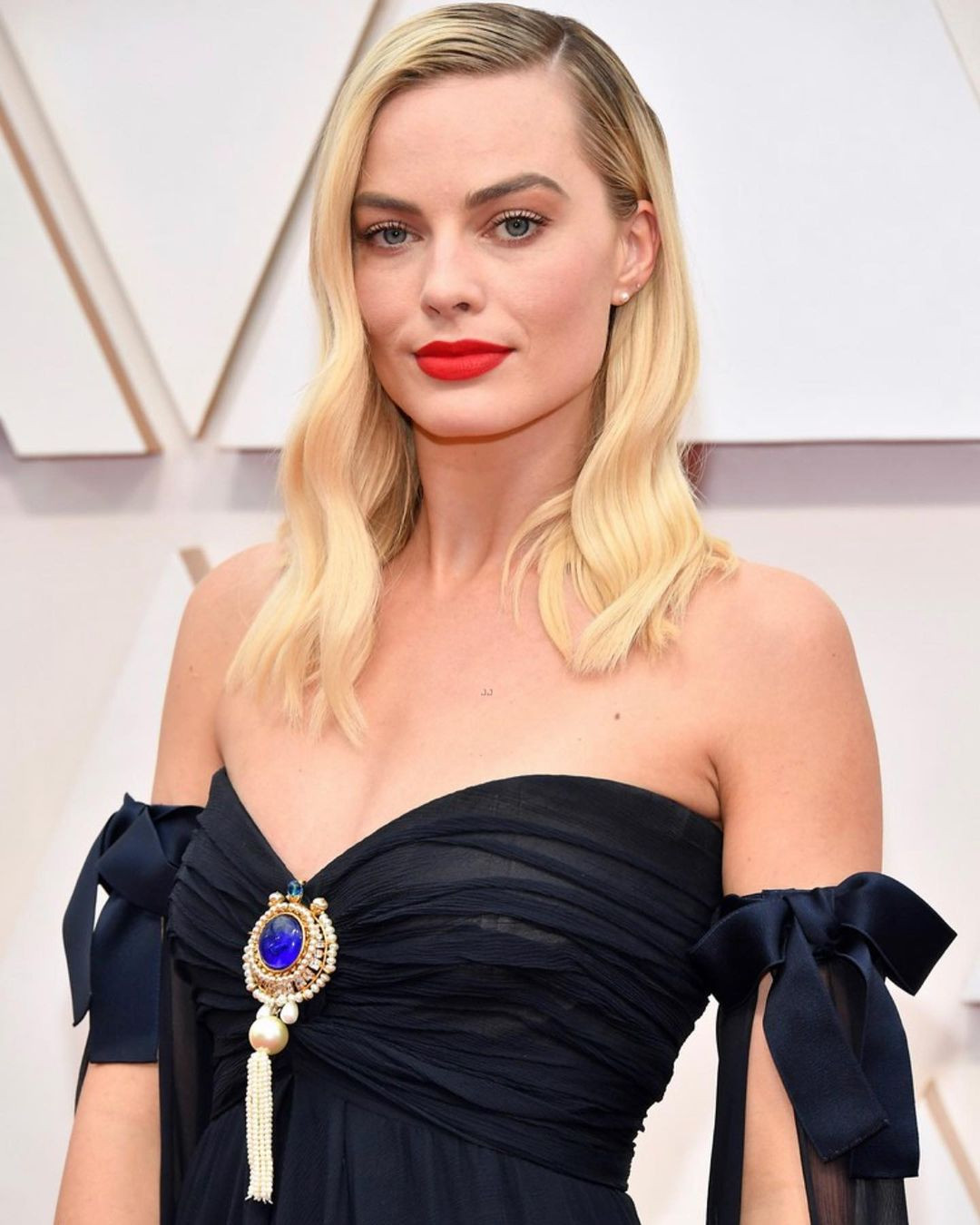 Margot Robbie rất ưa chuộng những mẫu đầm 2 dây, khoét sâu, kết hợp lối trang điểm không quá đậm.