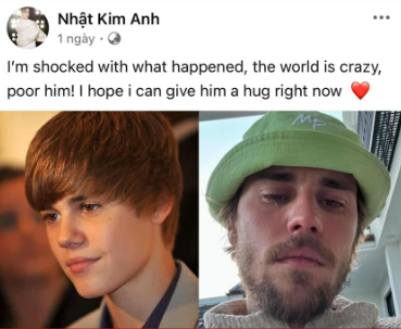 Trên trang cá nhân, nữ ca sĩ Nhật Kim Anh đã đăng tải dòng trạng thái bằng tiếng Anh lên tiếng về vụ việc này. Cô bày tỏ sự đồng cảm với Justin Bieber: "I'm shocked with what happened, the world is crazy, poor him. I hope I can give him a hug right now" (Tạm dịch: "Tôi bị sốc với những gì đã xảy ra, thế giới này thật đáng sợ, tội nghiệp anh ấy! Mong có thể ôm anh ấy ngay lúc này").