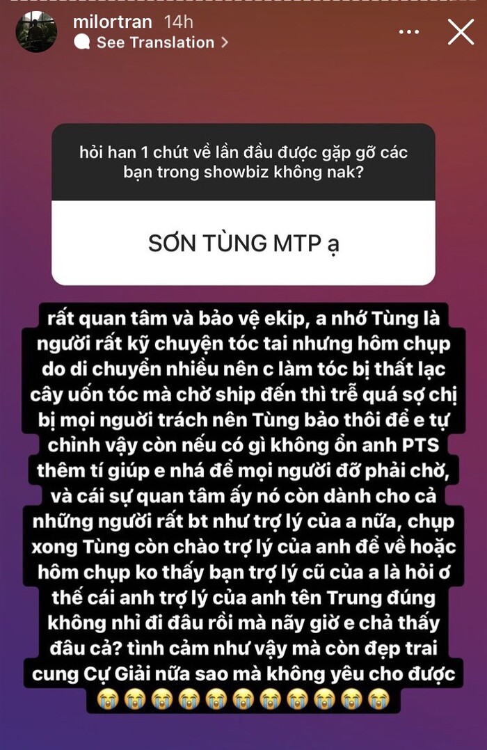 Và cái sự quan tâm ấy nó còn dành cho cả những người rất bình thường như trợ lý của anh nữa. Chụp xong Tùng còn chào trợ lý của anh để về hoặc hôm chụp không thấy bạn trợ lý cũ của anh là hỏi ơ thế cái anh trợ lý của anh tên Trung đúng không nhỉ? Đi đâu rồi mà nãy giờ em chả thấy đâu cả? Tình cảm như vậy mà còn đẹp trai, cung Cự Giải nữa sao mà không yêu cho được". Milor Trần chia sẻ.