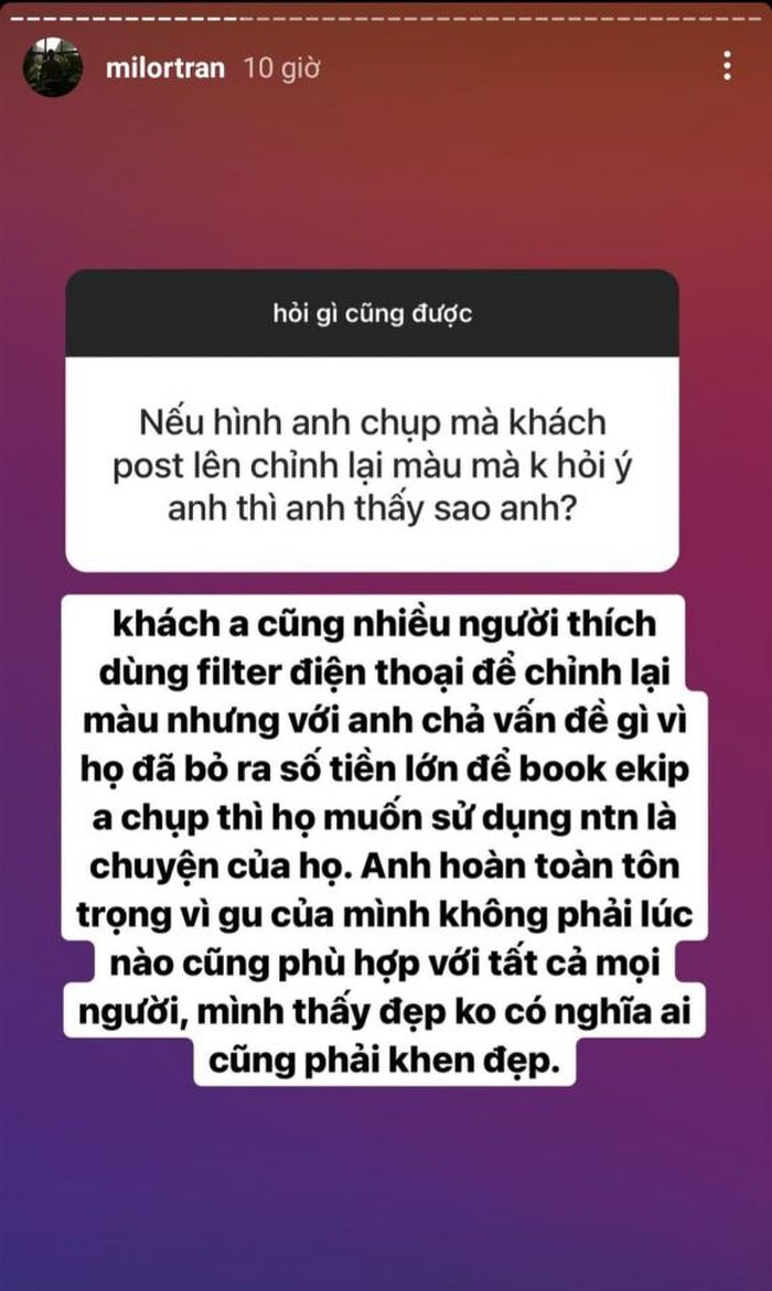 Theo đó, trên story ở Instagram cá nhân, trong chuyên mục Q&A, khi một tài khoản đặt câu hỏi: "Nếu hình anh chụp mà khách đăng lên chỉnh lại màu mà không hỏi ý kiến anh thì anh thấy sao?", Milor Trần đã hồi đáp: "Khách anh cũng nhiều người thích dùng filter điện thoại để chỉnh lại màu nhưng với anh chả vấn đề gì vì họ đã bỏ ra số tiền lớn để book ekip anh chụp thì họ muốn sử dụng như thế nào là chuyện của họ. Anh hoàn toàn tôn trọng vì gu của mình không phải lúc nào cũng phù hợp với tất cả mọi người. Mình thấy đẹp không có nghĩa ai cũng phải khen đẹp".