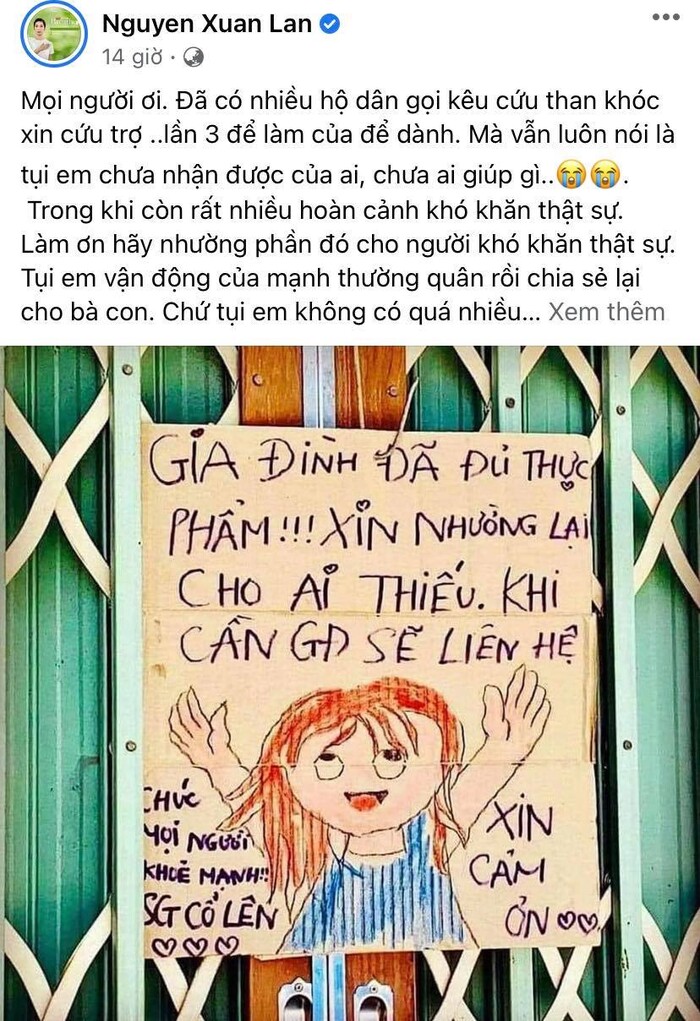 Xuân Lan cũng giải thích để mọi người hiểu rõ tình hình hiện tại không thể giúp đỡ để mọi người sung túc được. "Tụi em vận động của mạnh thường quân rồi chia sẻ lại cho bà con. Chứ tụi em không có quá nhiều để giúp bà con sung túc được. Giúp cho qua cơn đói, chứ không thể giúp để sung túc! Làm ơn!", Xuân Lan viết.