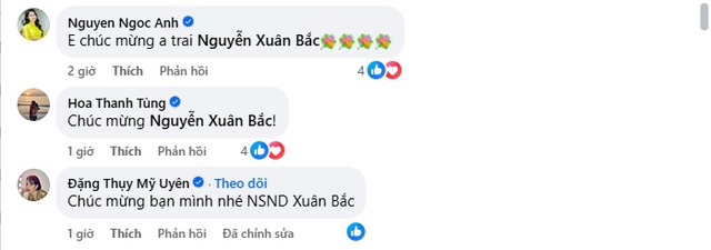 Diễn viên Kiều Anh gửi lời chúc: "Chúc mừng anh Nguyễn Xuân Bắc! Trên cương vị mới thành công rực rỡ ạ". Ca sĩ Minh Quân dí dỏm: "Chúc mừng bác Nam Tào Nguyễn Xuân Bắc được bổ niệm Cục trưởng Cục Nghệ thuật biểu diễn. Lần này 'Thiên đình' khao to". Nhà thiết kế nổi tiếng Đức Hùng cũng bày tỏ: "Chúc mừng em tôi trên cương vị mới. Tự hào ghê cơ ý!"