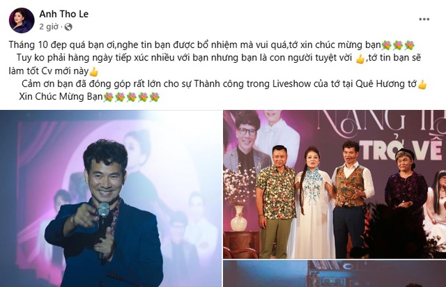 Anh Thơ chia sẻ cô may mắn khi vừa mời Xuân Bắc tham gia show diễn của mình tại Thanh Hóa. "Tháng 10 đẹp quá bạn ơi, nghe tin bạn được bổ nhiệm mà vui quá, tớ xin chúc mừng bạn. Tuy không phải hàng ngày tiếp xúc nhiều với bạn nhưng bạn là con người tuyệt vời. Tớ tin bạn sẽ làm tốt công việc mới này", nữ ca sĩ bày tỏ.