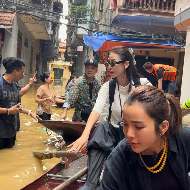 Thoạt nhìn những hình ảnh được tung lên mạng xã hội không ai không thấy lạ. Thay vì ảnh trực tiếp trao quà cho những hộ nghèo lại thấy ca sĩ và ê-kíp ngồi thuyền, người dân xung quanh đang lội trong nước, có chỗ quá gối. Chưa kể anh ăn mặc khá bảnh bao.