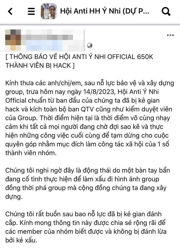"Quá trùng hợp, hôm qua quản trị viên và NTK kêu gọi từ thiện, nay nhóm lại có vấn đề", "Từ trước đến nay vẫn hoạt động theo mục đích như đã đề ra, đến khi liên quan chuyện tiền bạc thì xảy ra chuyện là sao nhỉ?", "Yêu cầu quản trị viên làm rõ vấn đề này",... là những bình luận về việc hội nhóm anti-fan Hoa hậu Ý Nhi bị chiếm quyền kiểm soát và tạm dừng hoạt động đột ngột.
