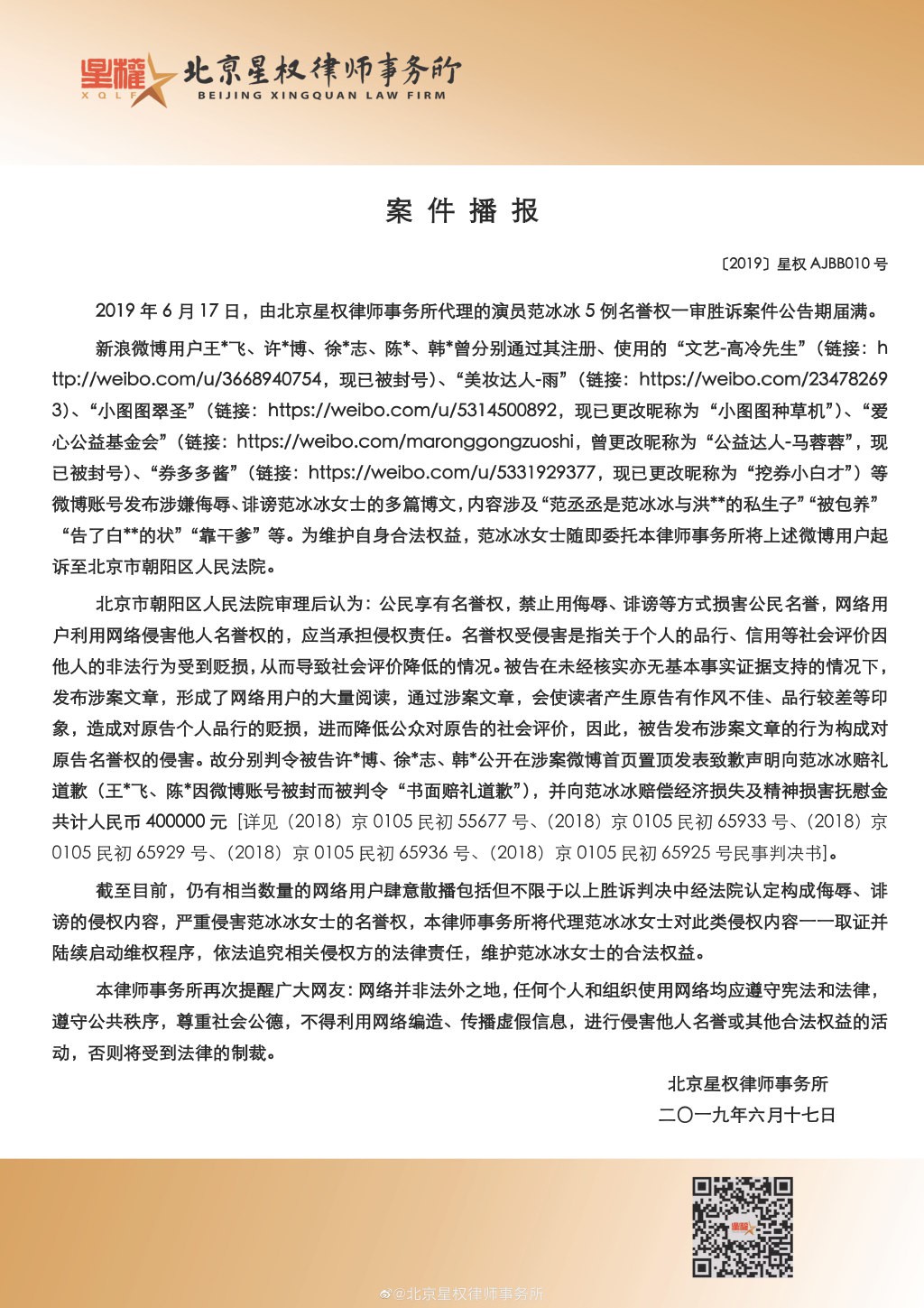 Mới đây, văn phòng luật sư Bắc Kinh đưa ra văn bản thông báo về việc Phạm Băng Băng đã thắng trong vụ kiện bị 5 người xúc phạm danh dự nhân phẩm.