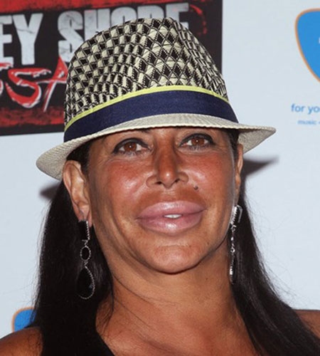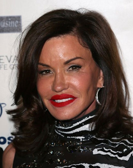 Cựu người mẫu Janice Dickinson với nụ cười gượng gạo, nhăn nhúm vì từng đi căng da mặt chống vết nhăn của tuổi tác. |