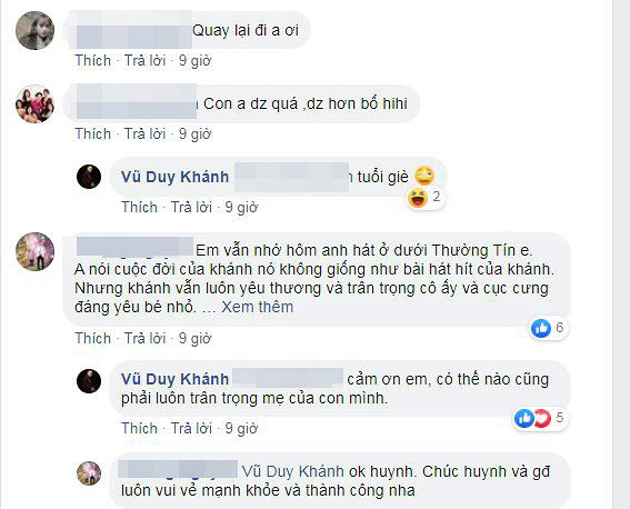 Qua chia sẻ của Vũ Duy Khánh, nhiều cư dân mạng ngưỡng mộ nam ca sĩ và DJ Tiên Moon: "Chúc hai con và con hạnh phúc thật nhiều", "Ngưỡng mộ anh chị", "Yêu lại từ đầu đi anh Khánh ơi", "Tuyệt vời, chuyện cổ tích ngày này"...