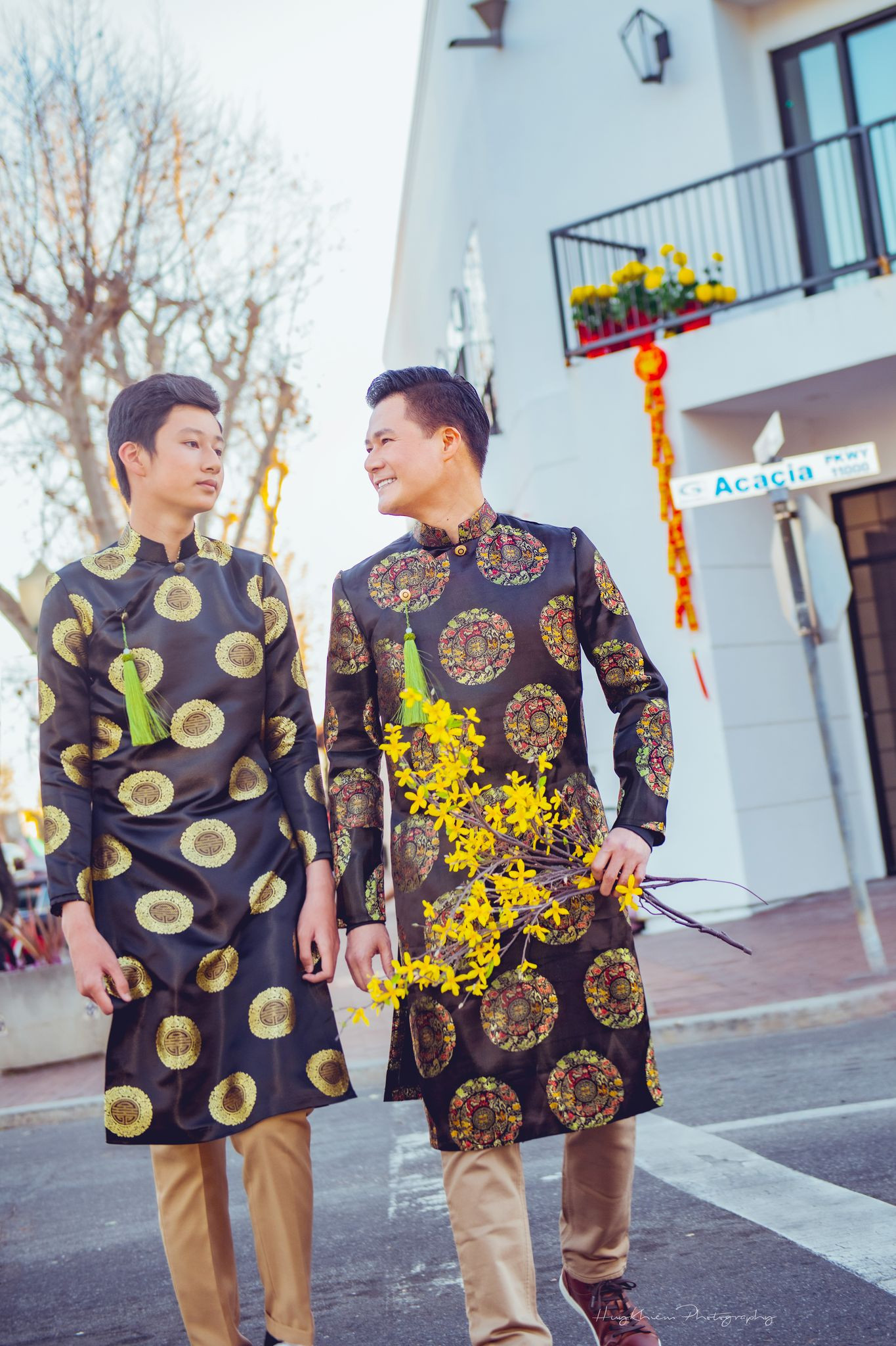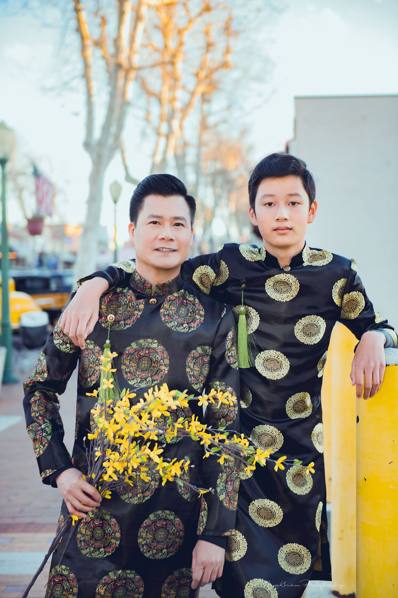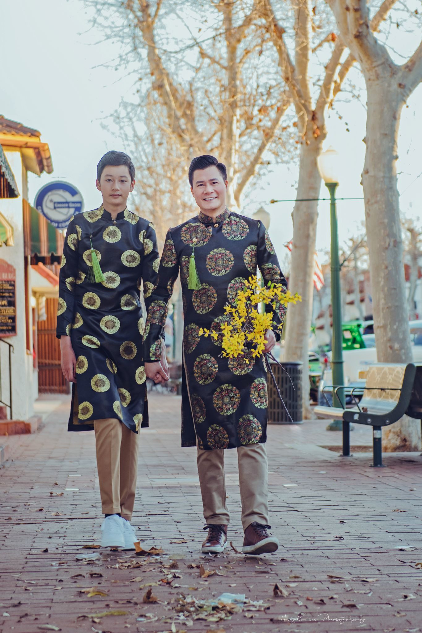 Mới 15 tuổi, Bảo Nam đã cao 1m9. Quang Dũng mong con trai không cao thêm nữa vì lo dáng cậu mất cân đối. Bảo Nam không thích chụp ảnh, kể cả khi đi chơi với bố. Những tấm ảnh bố con Quang Dũng mặc áo dài là lần hiếm hoi con chiều ý anh.