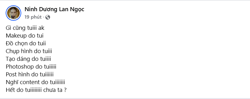 Dù vậy, Ninh Dương Lan Ngọc không có bất cứ chia sẻ nào liên quan đến việc mình bị lôi vào câu chuyện ồn ào. Trên trang cá nhân, nữ diễn viên vẫn cập nhật các hoạt động thường ngày. Mới đây nhất, Ninh Dương Lan Ngọc đăng tải bộ ảnh mới cùng dòng chú thích: "Gì cũng tôi à. Make up do tôi. Đồ chọn do tôi. Chụp hình do tôi. Tạo dáng do tôi. Photoshop do tôi. Post hình do tôi. Nghĩ content do tôi. Hết do tôi chưa ta?".