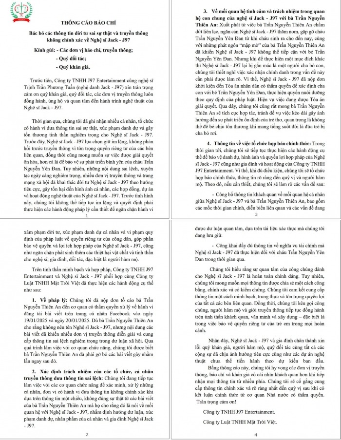 Không chỉ thế, Jack còn cho biết Thiên An chính là người chấm dứt liên lạc, ngăn không cho thăm nom, gặp gỡ con gái. Chứ không phải Jack "bỏ con" hay thiếu trách nhiệm với Yên Đan. Thông qua thông cáo này, phía Jack mong "Thiên An sẽ tích cực hợp tác, tránh để vụ việc kéo dài gây ảnh hưởng đến sự phát triển ổn định của trẻ thơ, quan trọng là không thể để bé chịu tổn thương khi mang tiếng suốt đời là đứa trẻ bị cha bỏ rơi".