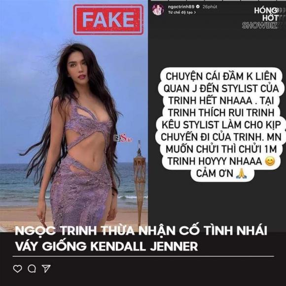 Chưa được khen ngợi bao lâu, mới đây, Ngọc Trinh lại bị một nhà thiết kế đình đám tố "đạo nhái rẻ tiền", cố tình bắt chước mỹ nhân đình đám Kendall Jenner. Cụ thể, người này đã đăng đàn với nội dung cực gắt và chỉ trích thẳng thừng bạn thân Vũ Khắc Tiệp: "Ngọc Trinh đang mặc thiết kế hoa oải hương nhái lại Kendall và không đời nào chúng tôi may loại này. Ngọc Trinh, nếu bạn muốn váy của tôi, hãy gửi email và trả tiền, tôi sẽ làm cho bạn một cái. Hãy dừng việc đạo nhái các nhà thiết kế trẻ tuổi đi".