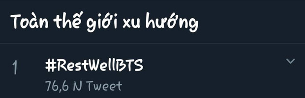 Ngay khi thông báo được đưa ra, hashtag #RestWellBTS đã dẫn đầu top trending toàn thế giới. Fan hoàn toàn ủng hộ quyết định này của BTS. Trong khi đó, Big Hit một lần nữa ghi điểm trong mắt người hâm mộ khi luôn biết nghĩ cho tình trạng sức khoẻ của thần tượng, dù BTS đang ở thời kỳ đỉnh cao với hàng loạt kế hoạch cần thực hiện.