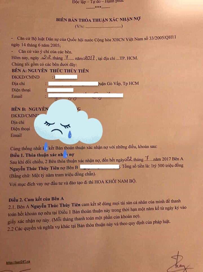 Theo đó, giấy tờ ghi nợ của hai bên được tiết lộ cho thấy Nguyễn Thúc Thùy Tiên vay 1,5 tỷ đồng vào ngày 22/7/2017 với lý do đầu tư và đào tạo đi thi Hoa khôi Nam Bộ 2017, nơi cô đoạt giải Á khôi.