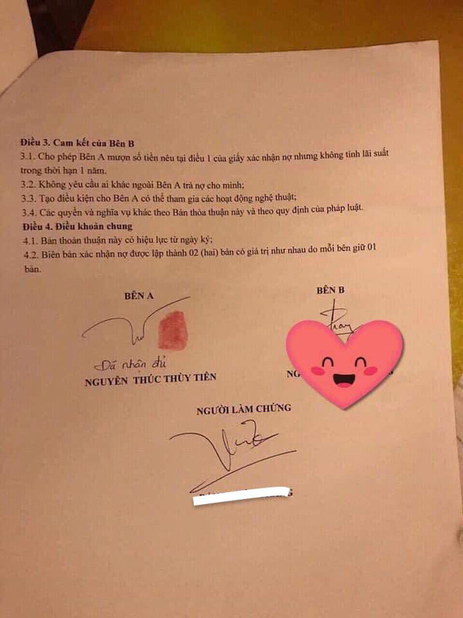 Trong đó, Thùy Tiên cam kết sẽ dùng mọi tài sản cá nhân của mình để thanh toán hết khoản nợ trong 1 năm (tức đến 22/7/2018), mỗi tháng trả một phần. Bên dưới biên bản có đầy đủ chữ ký và dấu vân của Thùy Tiên cùng xác nhận đã nhận đủ tiền.